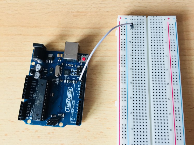 Jetzt nehmen wir den ersten Draht und verbinden den Arduino mit dem Breadboard. Ich habe mich dabei für die Lösung über die Anschlusspin 13 beim Arduino und die 5 auf dem Breadboard entschieden. Dazu sei gesagt, das es auf dem Breadboard sowie dem Arduino fast egal ist wo ihr sie miteinander verbindet. Auf dem Arduino würde ich persönlich jedoch immer die Anschlusspins von 8 – 13 verwenden.