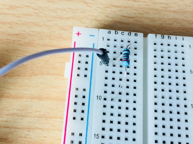 Jetzt bringen wir unseren 220Ohm Wiederstand auf dem Board an. Dazu nutzen wir die selbe Reihe (bei uns 5) auf dem Breadboard wie unser kommende Verbindungsdraht vom Arduino. Das andere Ende des Wiederstandes stecken wir der Einfachhalthalber in Reihe 10. Wir brauchen diesen Wiederstand, weil unsere LED später bei knapp 20mA arbeitet und ohne diesen Wiederstand die Gefahr besteht das unsere LED durchbrennt.