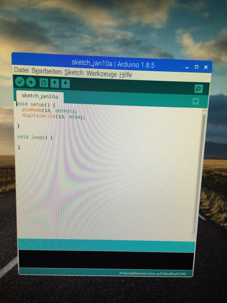 Dafür speichern wir den Code und drücken auf die -> Pfeil-Taste (2. Symbol von Links) um den Sketch auf den Arduino hochzuladen.