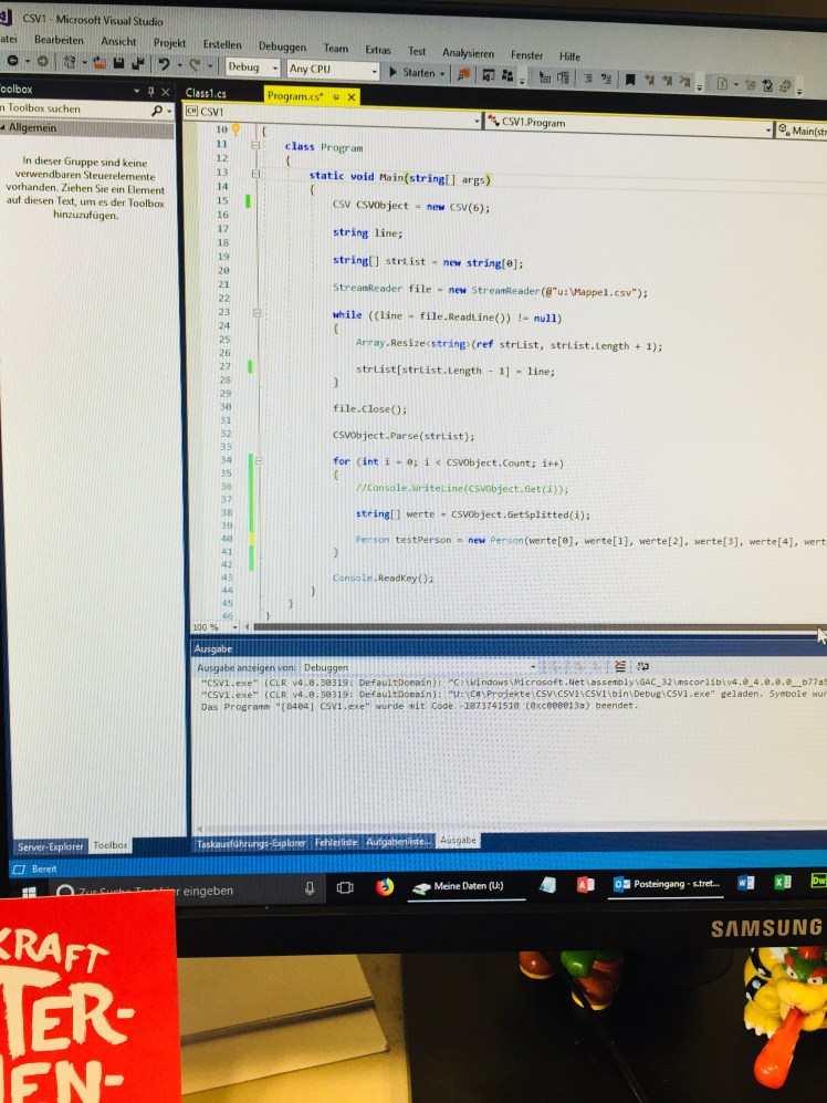 Ebenso positiv fiel am Donnerstag mein ersten Arbeitstag in meiner Firma aus. Da ich am Montag noch Geburtstag hatte und bis einschließlich Mittwoch krankgeschrieben war, gab es viele Gratulationen nachträglich sowie eine Karte und Blumen. Ich habe mich dann mit selbst gebackenen Kuchen am Freitag revanchiert. Außerdem habe ich in den 2 Tagen in der Programmierung mit C# wieder einiges dazugelernt und freue mich schon sehr, morgen weiterarbeiten zu dürfen.