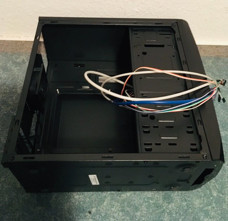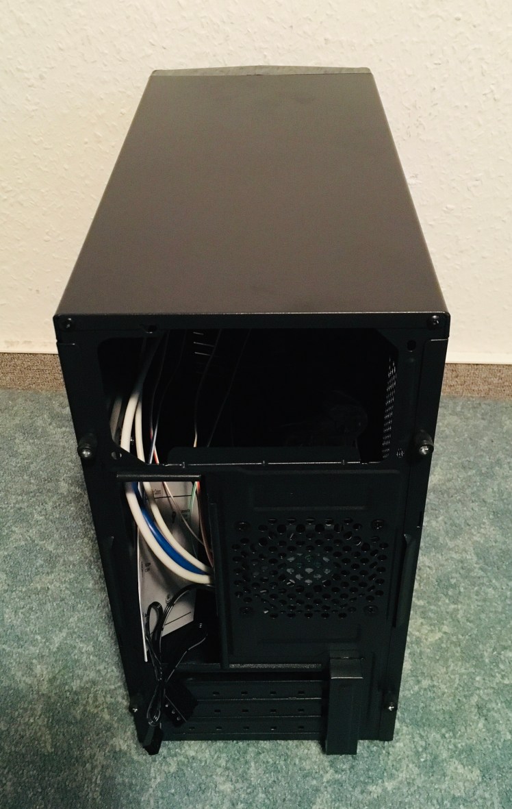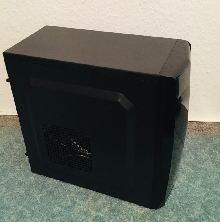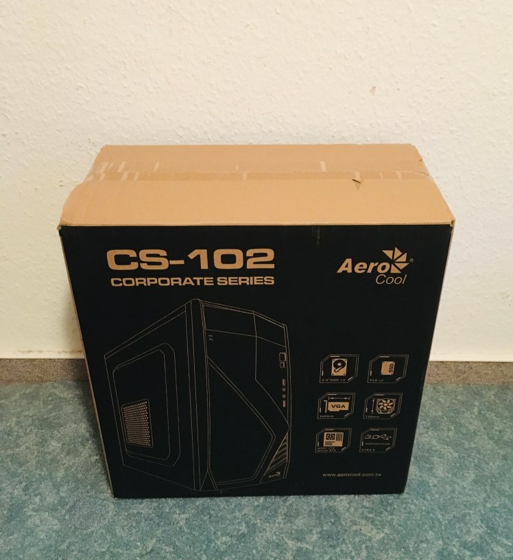 Wir haben uns beim Community-Tower-Projekt für ein micro-ATX-Gehäuse entschieden, nämlich das CS-102 von AeroCool. Haupgrund für den Kauf des Gehäuses war einfach die Außenmaße. Es ist gerade einmal 19,5cm Breit x 41,0cm Hoch x 42,3cm Tief und kann ua. 3x 3’5 Zoll-HDD-Festplatten/Laufwerke sowie 2x 2’5-Zoll-SSD-Festplatten fassen. Außerdem eine Grafikkarte von einer Länge bis zu 24,0cm, ein Prozessorlüfter mit einer Höhe von bis zu 15,0cm, ein Mainboard im Formfaktor mini-ITX oder mirco-ATX sowie ein ATX-Netzteil.
