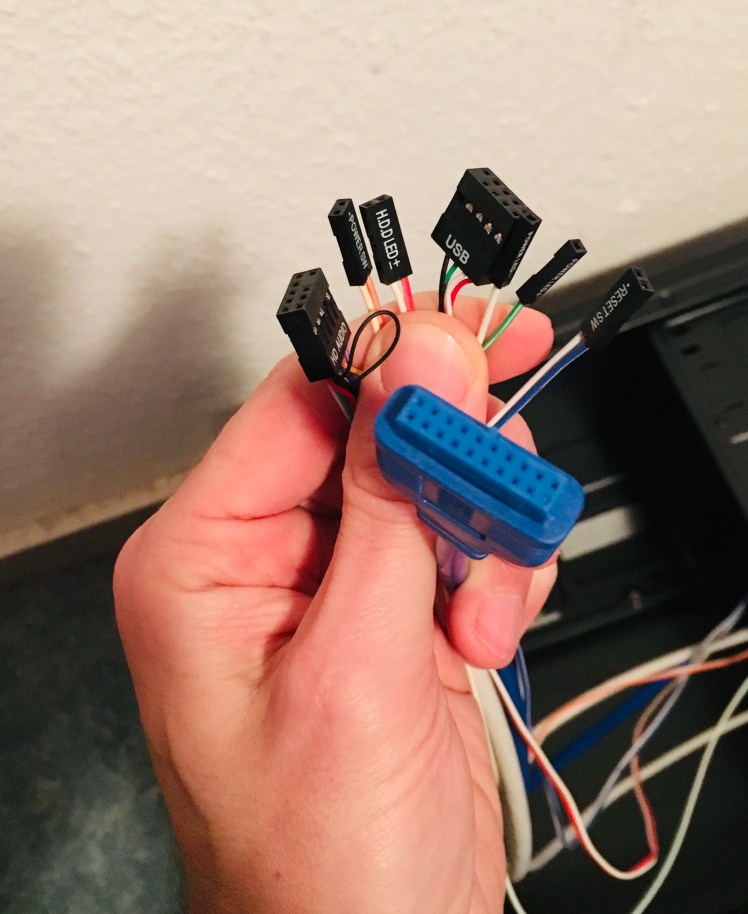 Verkabelung für den Frontbereich. Sehr Positiv, sogar mit Beschriftung. Festplatten-LED, Ein/Aus-Knopf, Reset-Knopf, USB, Power-LED, Audioanschlüsse, USB3.0 (der blaue „Dicke“)