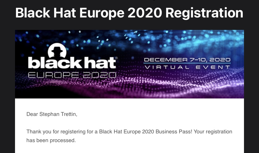 Privat beschäftigte ich mich mal wieder mit dem Thema Netzwerk-/Internetsicherheit und nutzte die Gelegenheit mit für die diesjährige BlackHat Europe im Dezember anzumelden.