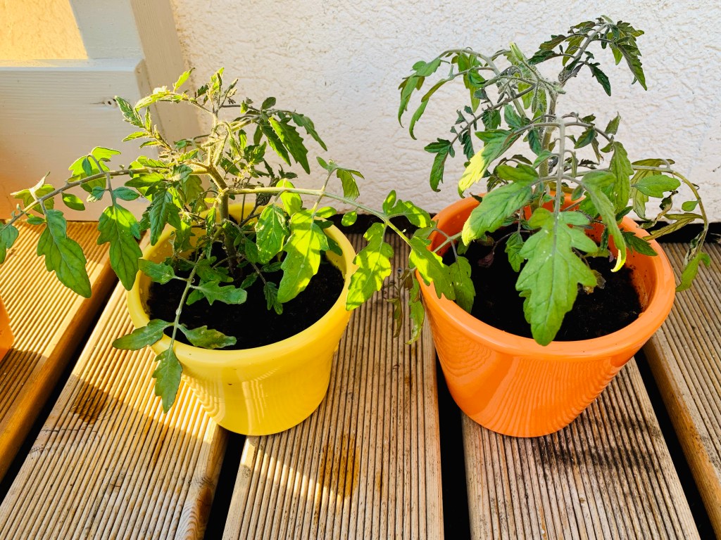 Übrigens, meine Tomaten wachsen ganz hervorragend auf meiner Terrasse. Bis zur Ernte dauert es zwar noch ein gutes Stück und größere „Töpfe“ (Mir fällt gerade das Wort nicht ein…) bräuchte ich auch noch, aber die ersten Blüten sind schon da.