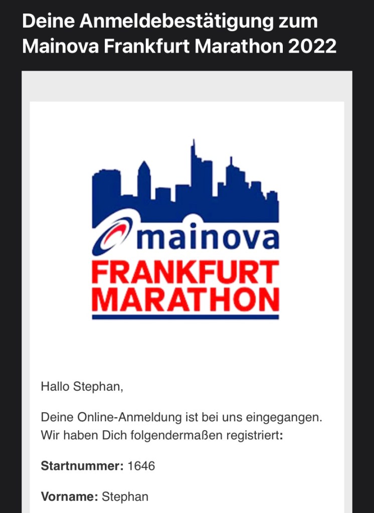 Dafür bin ich heute Früh schon 21km gelaufen. Am 5.September habe ich solch eine lange Distanz das letzte Mal zurückgelegt. Insgesamt kamen in dieser Woche 8,5h Sport – bei 4 Lauf-, 3 Rad- und 1 Athletikeinheit – zusammen. Außerdem durfte ich mich heute schon vorab zum Frankfurt Marathon im nächsten Jahr anmelden. Da ich für dieses Jahr angemeldet war (was übrigens heute wäre) und man sozusagen ein Voranmelderecht hat.