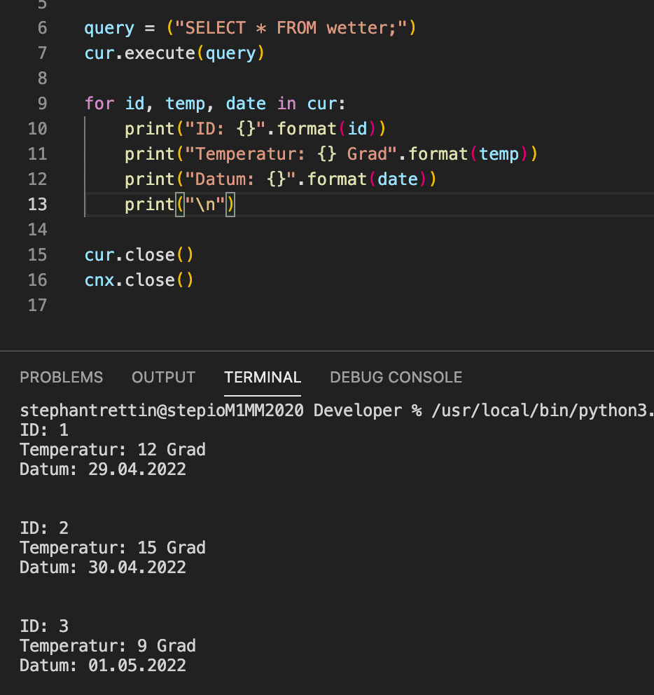 Blieb dann noch Privat etwas Zeit habe ich mich mit Datenbanken und Python befasst. So plane ich mit einem Mikrocontroller ein paar Temperaturwerte auszulesen (Temperatur, Luftfeuchtigkeit, UV-Strahlung etc..) und diese per Python-Script dann zukünftig zu speichern. Das Script und die Datenbank funktioniert schon einmal, so dann ich mich in den nächsten Tagen mit dem Mikrocontroller befassen werde.