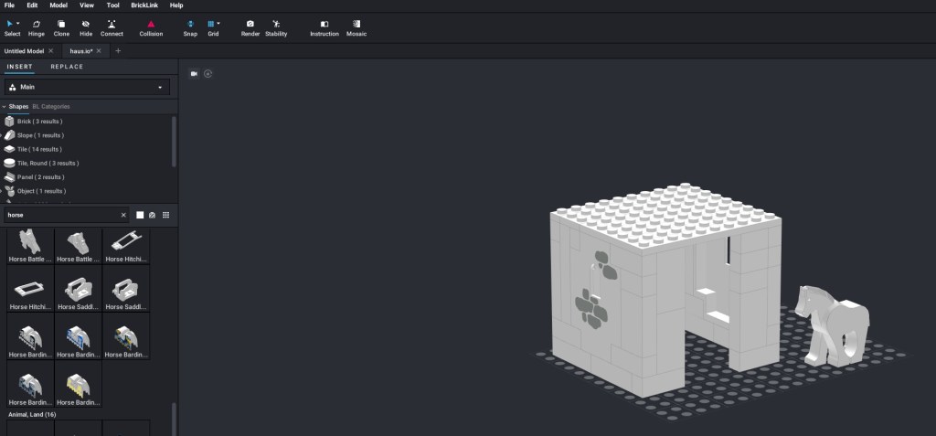 Wer also selbst mal Lust hat ein eigenes Lego-Set zu entwerfen, sollte sich die Software mal anschauen. Mit der Bedienung muss man sich etwas vertraut machen, aber man bekommt schnell etwas entworfen – so wie meinen Pferdestall: