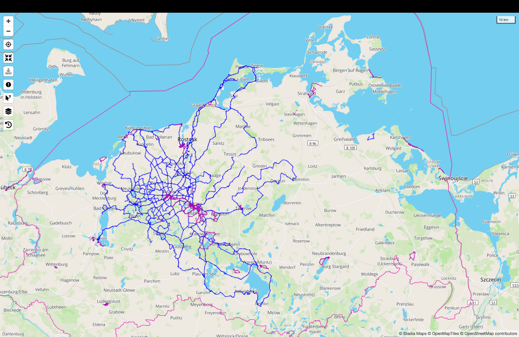 Außerdem nutzt ich seit einiger Zeit ja noch wandrer.earth zur Tourenplanung am Wochenende. Durch Hochladen bisheriger Tracks, zeigt die Seite einem an – wo man überall auf der Welt schon unterwegs gewesen ist. Hier gibt es mal einen Ausschnitt von meinen gefahreren MV-Touren. Von insgesamt 59.331,4 Straßenkilometern habe ich bisher ganze 4.514% erfahren. Ihr seht also, da ist noch einiges an Potenzial da.