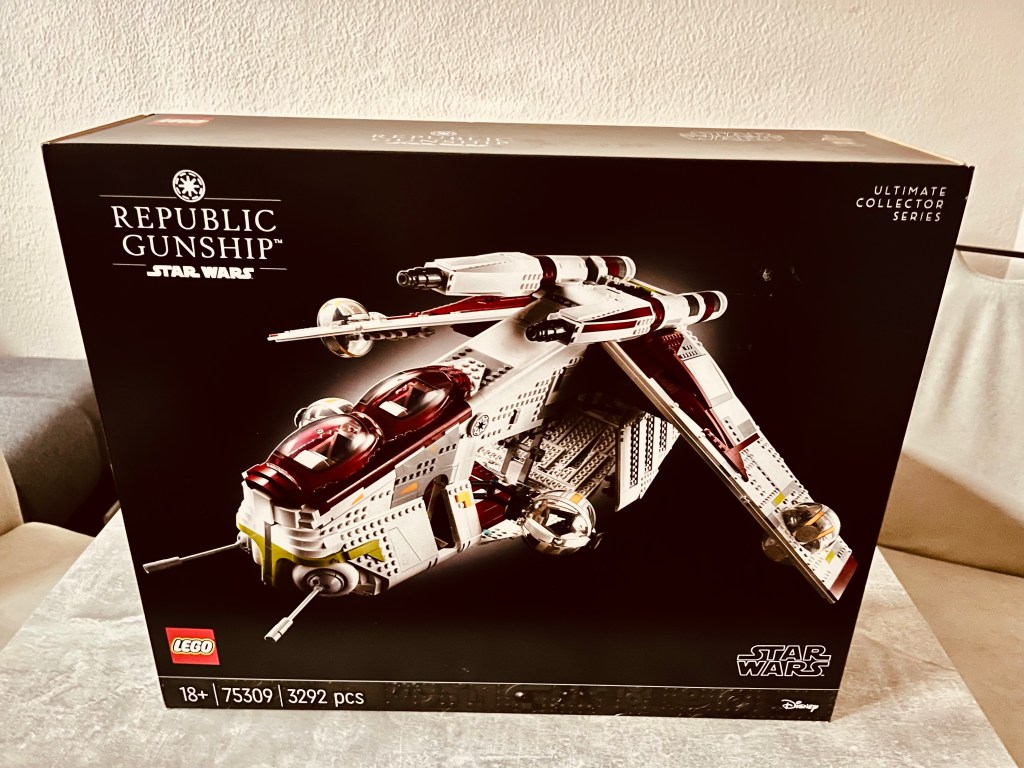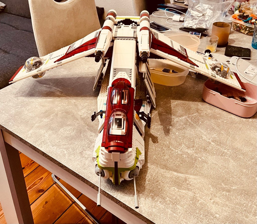Außerdem sind wir kurz vor der Vollendung von einem Republic Gunship aus der StarWars-Reihe (75309). Genauer gesagt handelt es sich um ein Modell aus der UCS-Reihe. Das bedeutet, diese Lego-Sets sind besonders detailgetreu und in der Regel auch etwas größer.